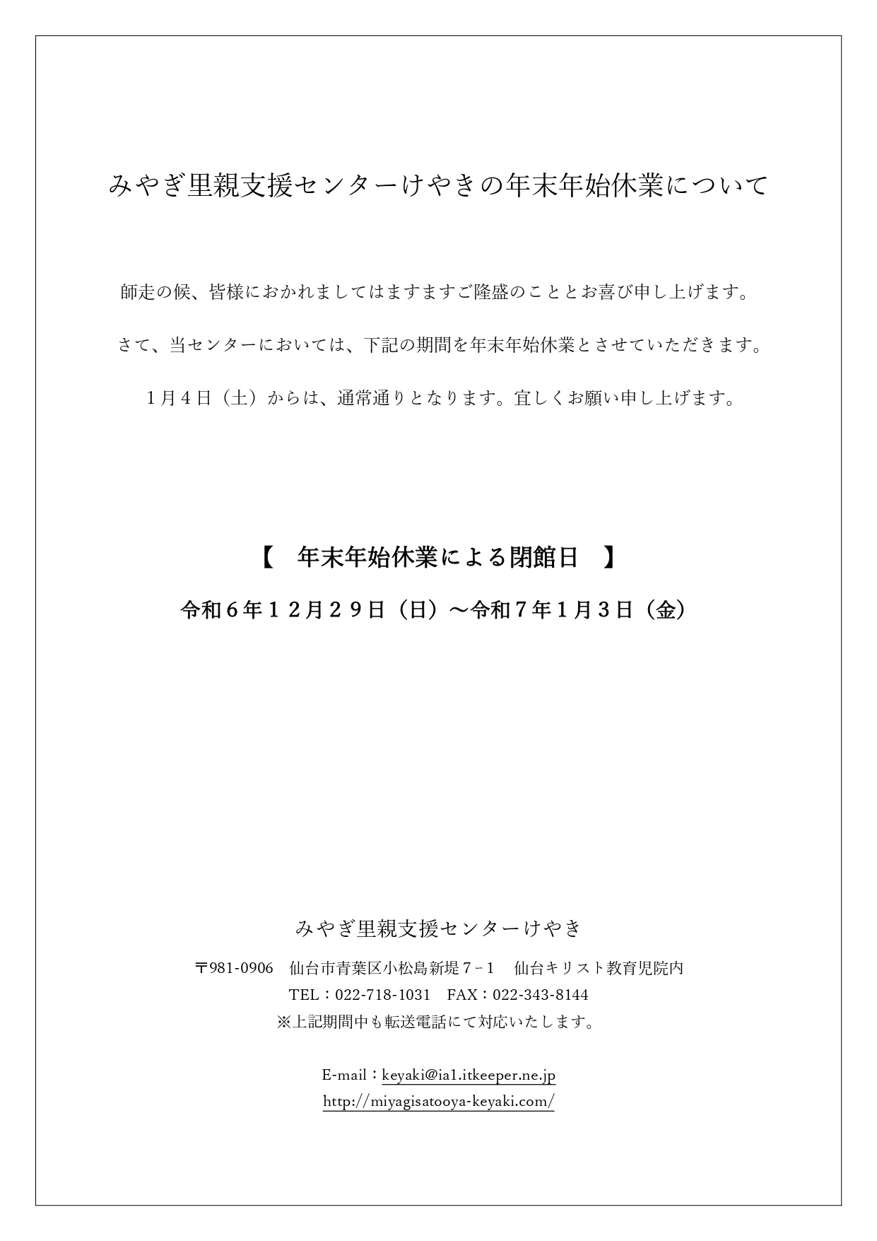 みやぎ里親支援センターけやきの年末年始休業について