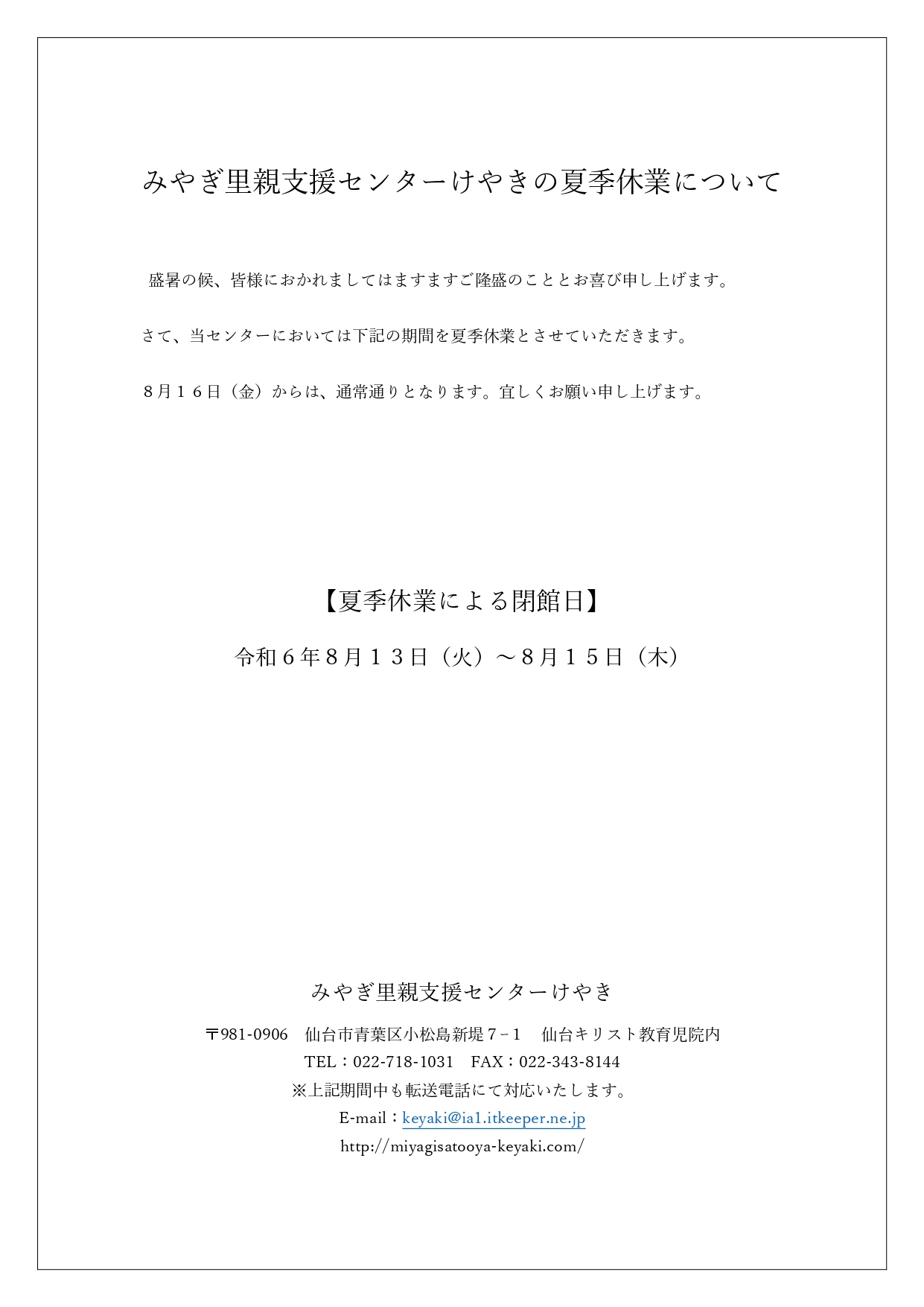 みやぎ里親支援センターけやき 夏季休業のお知らせ