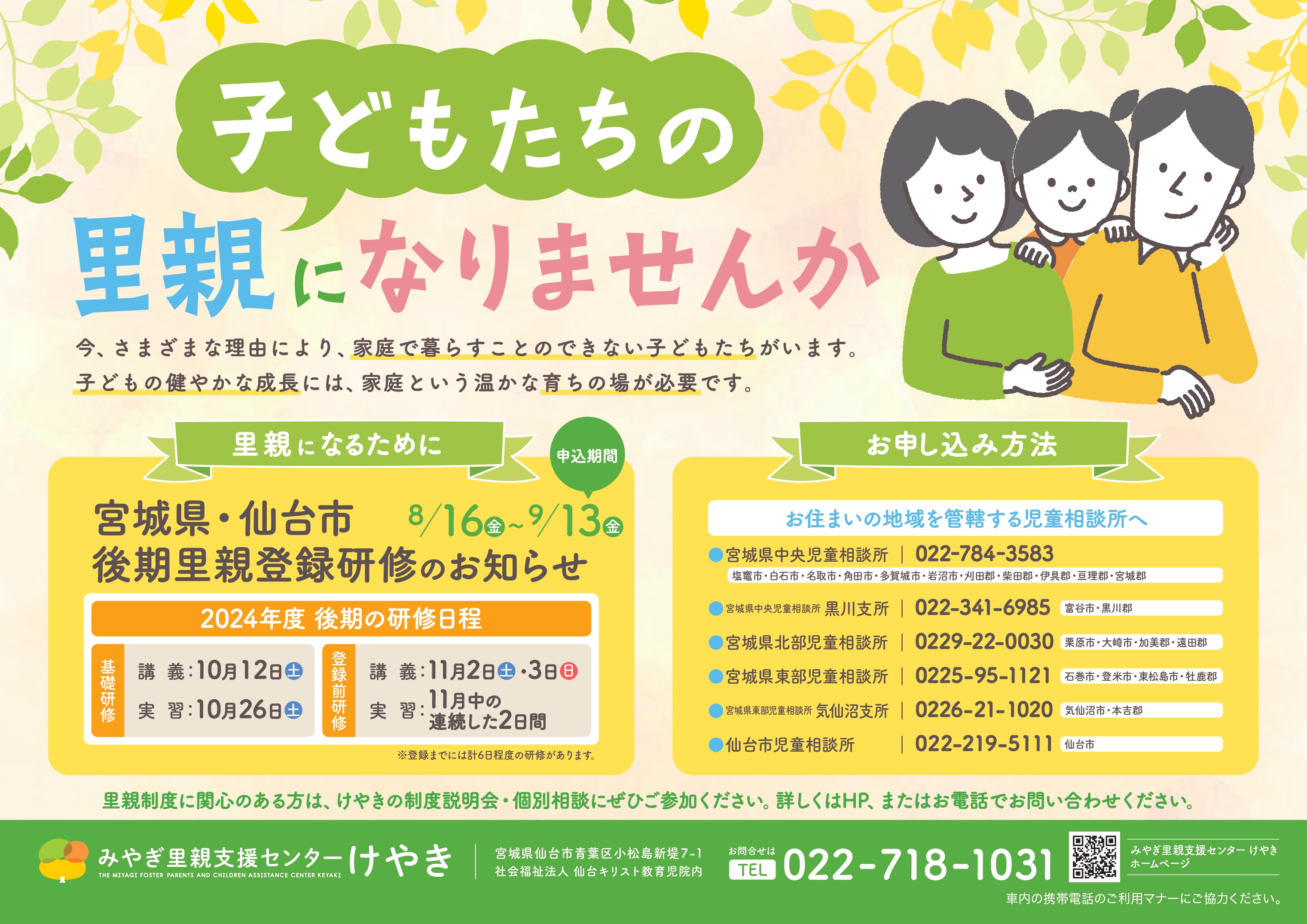 令和6年度 宮城県・仙台市後期里親登録研修のお知らせ